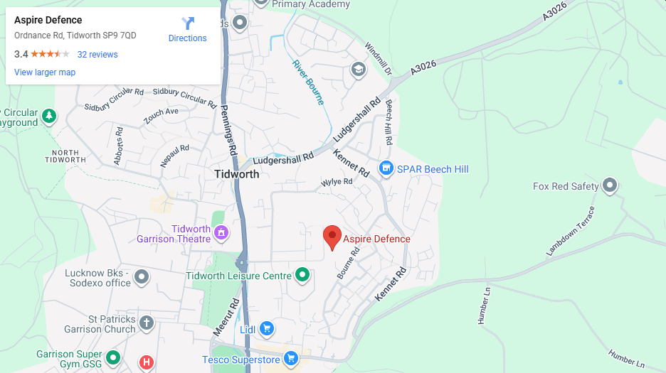 When you reach the village of Tidworth, turn left at the second mini roundabout into Ordnance Road. Follow the road to the top and turn left. The Aspire Business Centre can be found on your right.